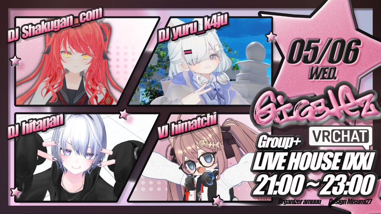 📝Giga関連(提供・歌唱・作編曲含む)楽曲をメインに、 アニメ ⁄ ボカロ ⁄ VTuber ⁄ J-POP など、原曲・Remixがたくさん聴けるオールジャンルDJイベントです! DJ 21:00- Shakugan_com 21:40- yuru_k4ju 22:20- hitapan VJ himatchi